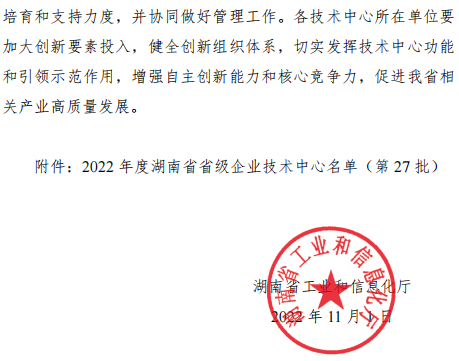 近日,湖南省工業(yè)和信息化廳公布了2022年度湖南省省級(jí)企業(yè)技術(shù)中心名單,我司榜上有名。這是我司繼5月份被評(píng)為湖南省專精特新“小巨人”企業(yè)后,斬獲的又一省級(jí)榮譽(yù)。
